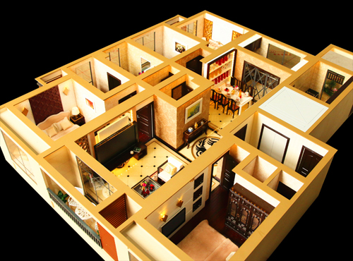 超杰建筑模型地产打造精美,细致,高大上的户型模型。整套户型模型的颜色搭配协调,不管是沙发,茶几,背景墙等都可以突出户型的空间感,让人感到温馨、亲切。